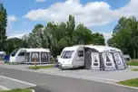 Hardstanding touring pitches for caravans and motorhomes up to 8m in length and 10m wide, with gravel area for awning. It may not be possible to fit an annexe onto the awning. 16 amp prepaid metered electric and digital/analogue TV aerial connection.