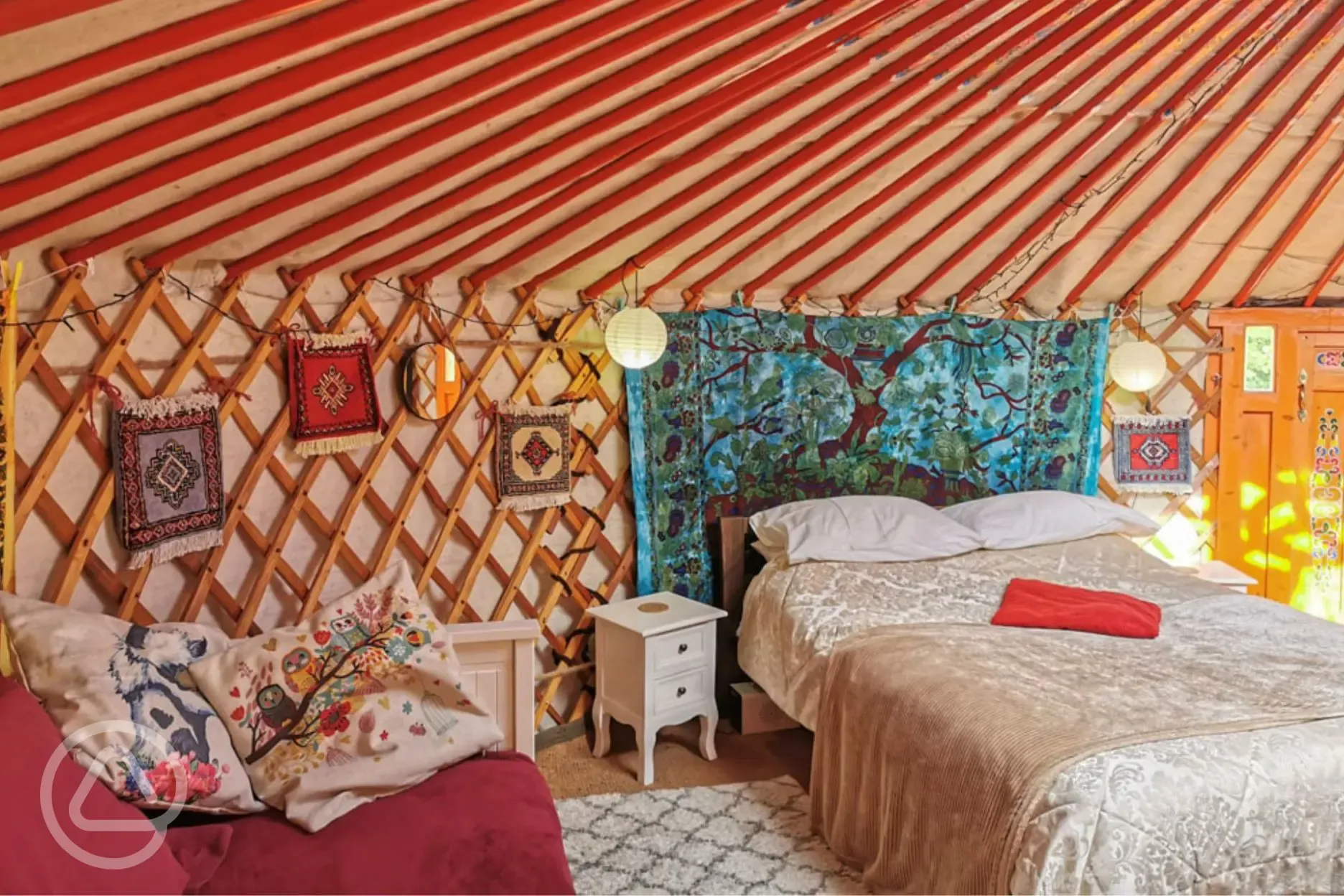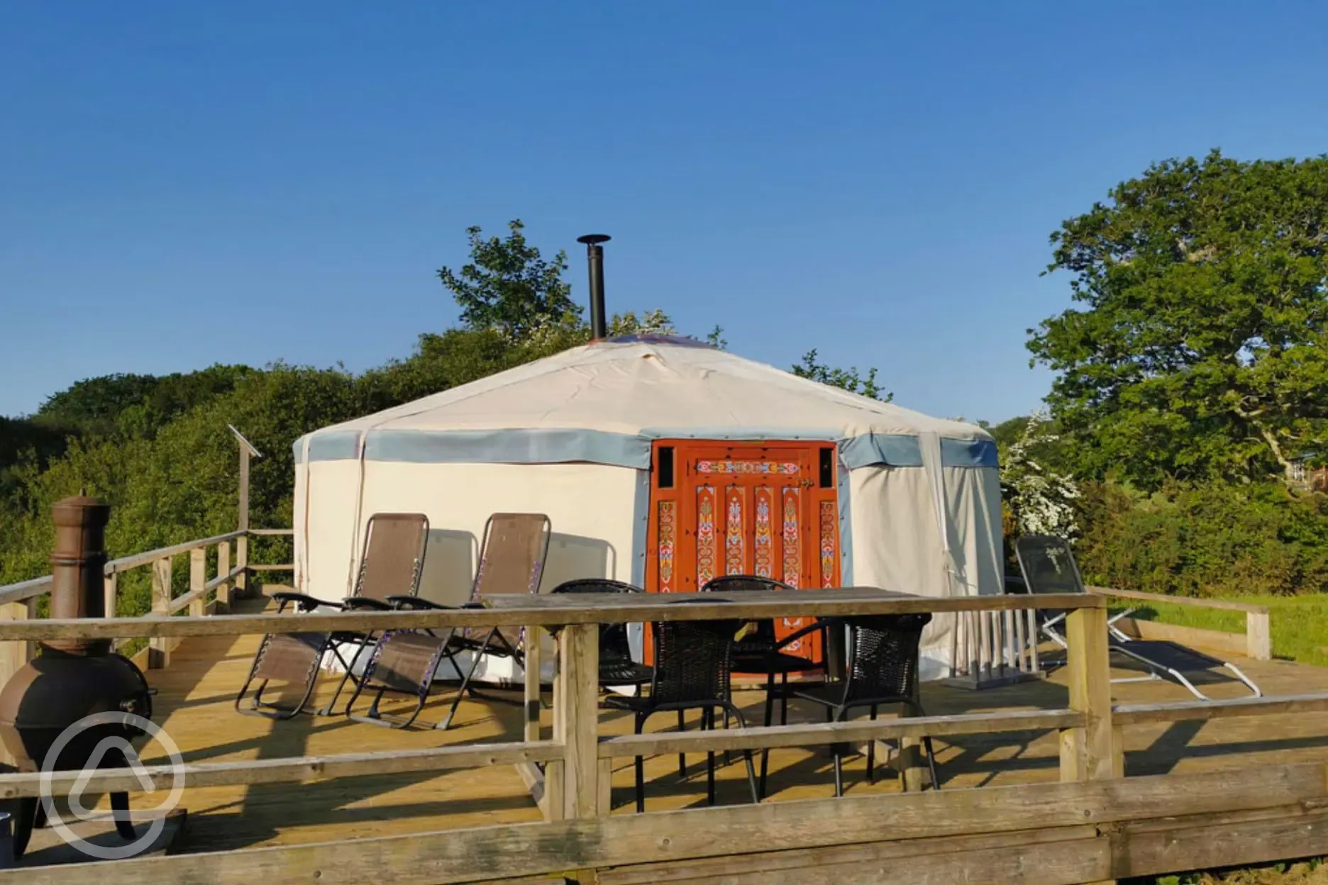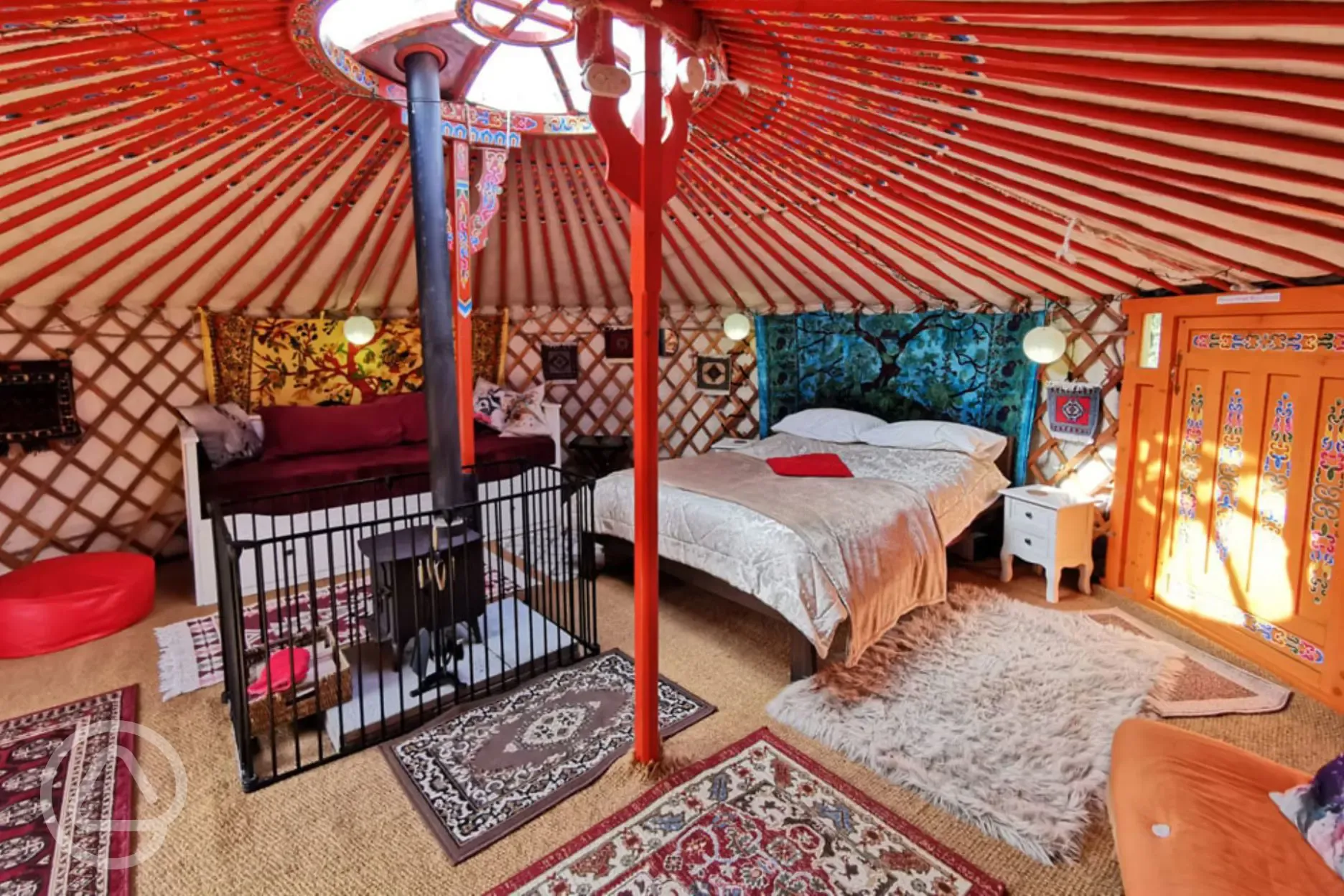 A 19ft yurt equipped with a double bed, two 3ft futon beds, an extending day bed, log burner and soft furnishings. Outside is a decking area with outdoor furniture and a chiminea. Designated toilet and shower facilities in a shared block nearby.
