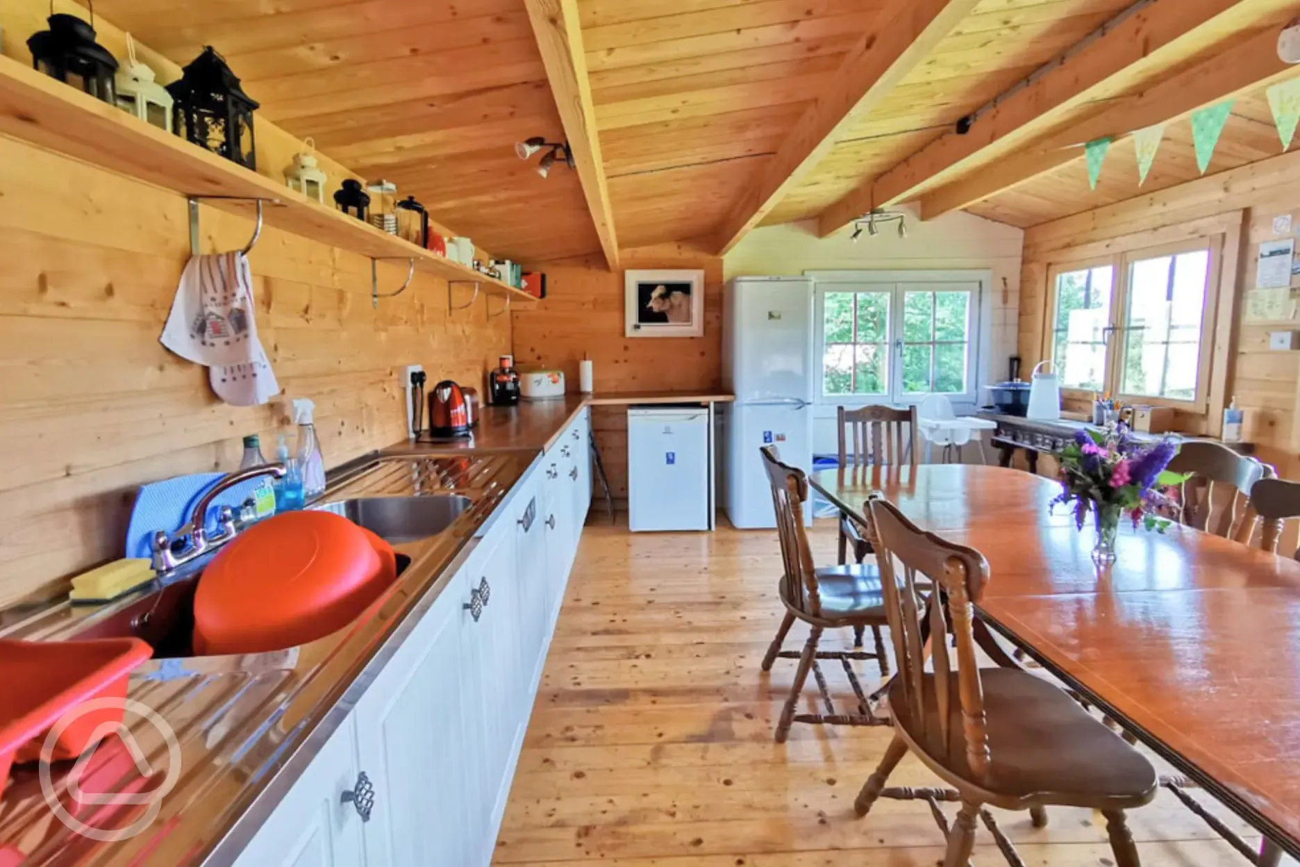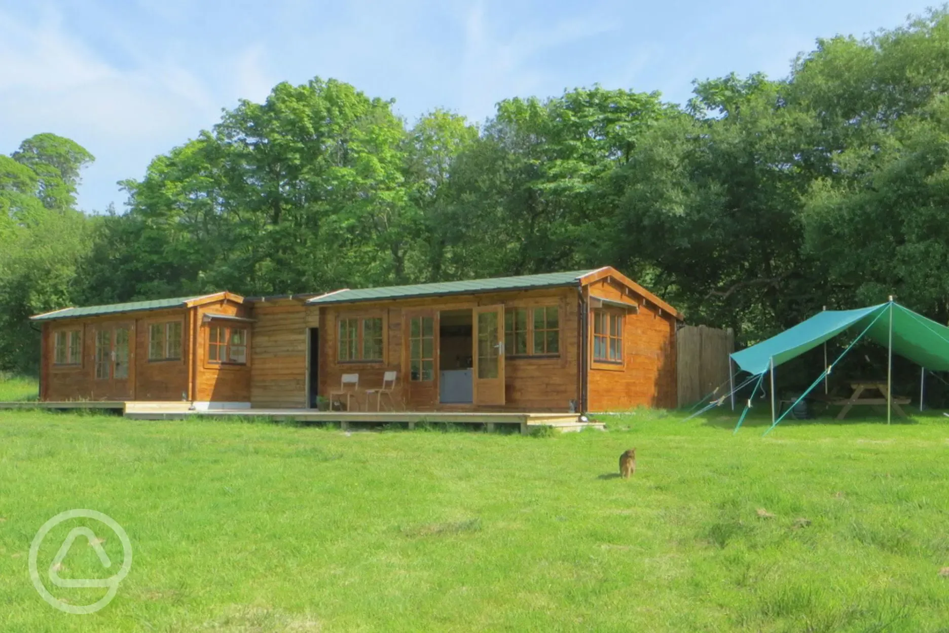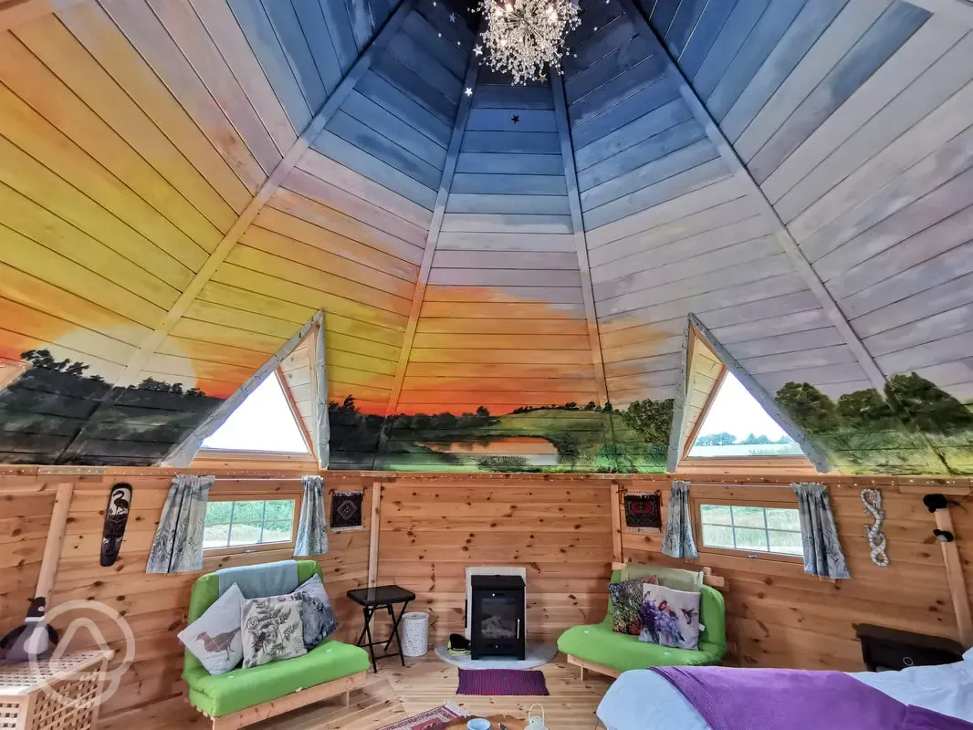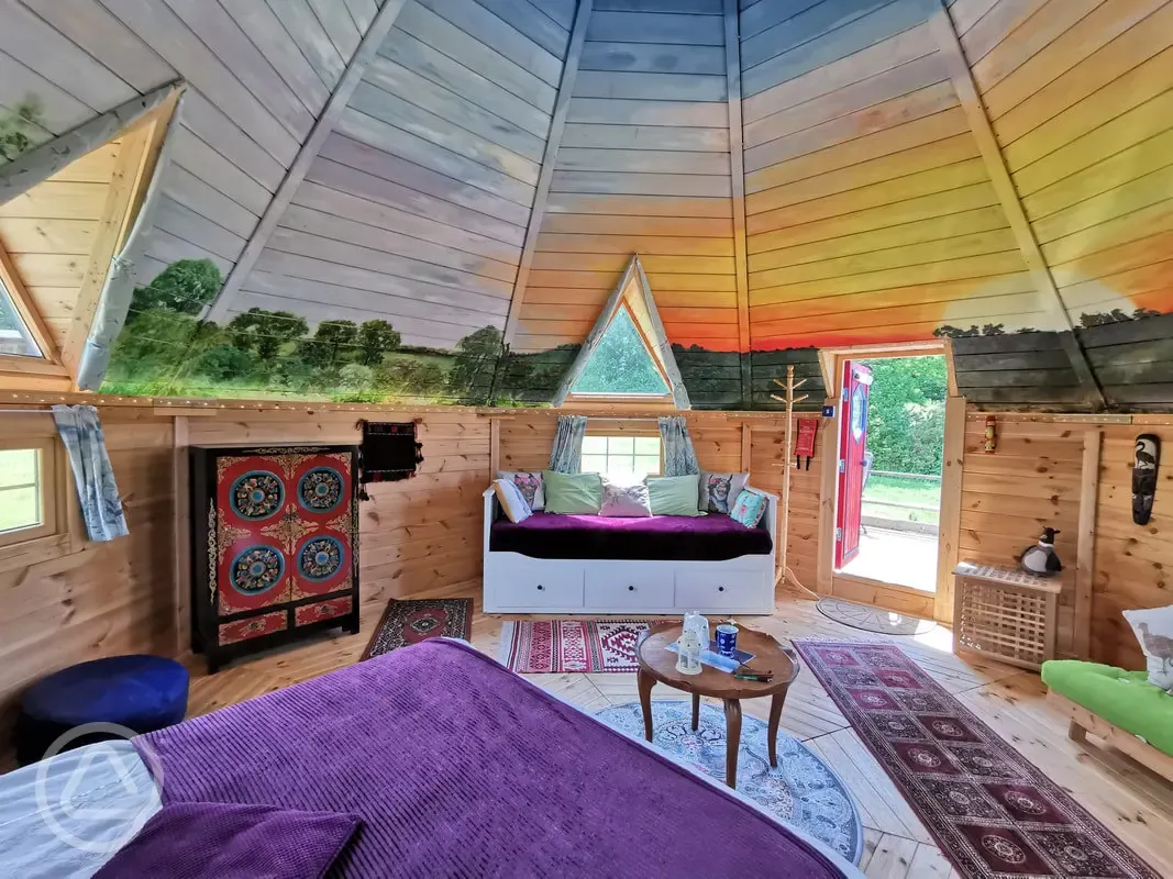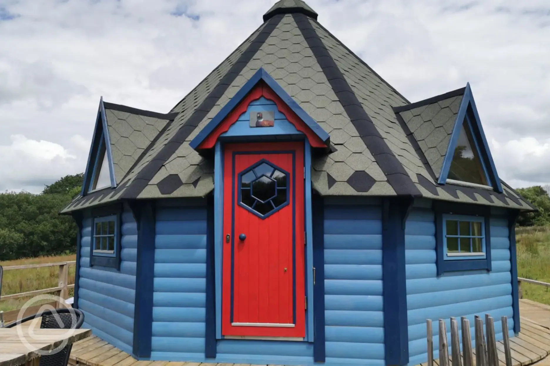 An octagonal glamping cabin with a king size bed, daybed and futons. Outside is a decking area with outdoor furniture and a chiminea. Designated toilet and shower facilities in a shared block nearby.