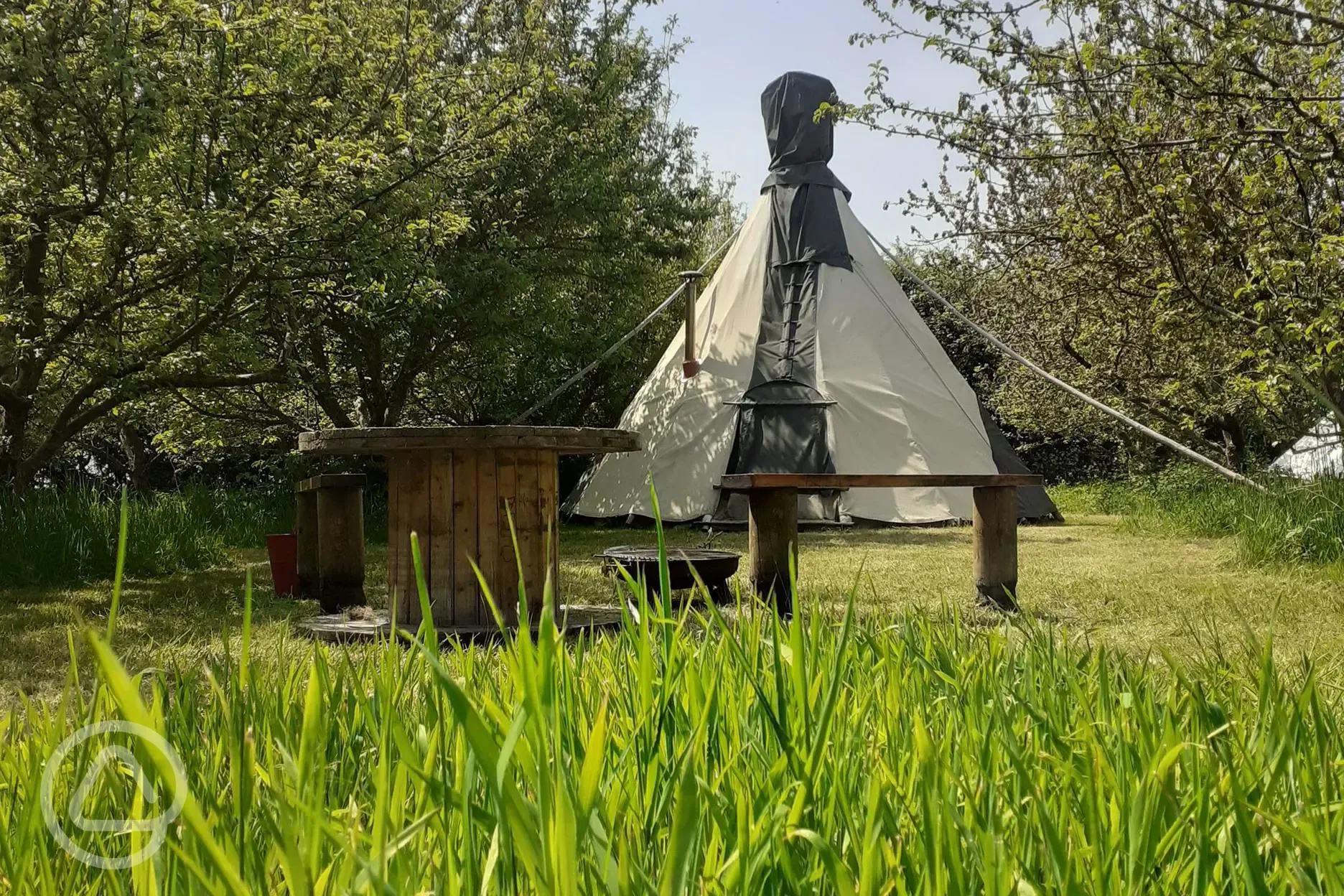 Fen End Farm includes 117 acres of fabulous organic farmland, run with all things eco in mind and offering more than enough space to spread out and relax. Bring your tent and choose from four grass pitches scattered amongst the orchard apple trees. As the parking is in a grass field adjacent to the orchard, wheelbarrows are provided to transport your belongings to your camp. A campfire by your pitch and a few marshmallows is the perfect way to rustle up an evening snack. For glampers, take your pick from a wide range of accommodation. Relax in the handcrafted yurt, which has its own king size bed, wood burner and space for five or cuddle up around the fire pit for an evening under the stars. There are also two traditional bell tents with double beds and a glam tipi with a king size, each with the warmth of a wood burning stove. All include their own fire pit. Sorry, no dogs allowed here.