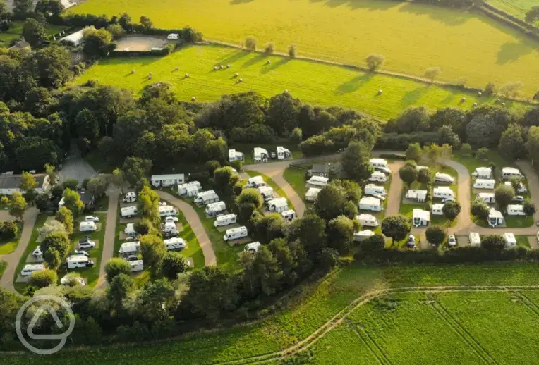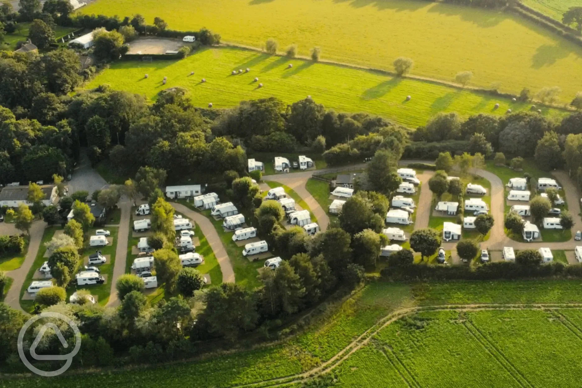 Hardstanding all weather pitches for tourers up to 7.5m, limited availability for larger units. 16-amp electric, mains water and grey waste to pitch side. landscaped across three seperate levels so never feels crowded. dog walk and off lead area on site.