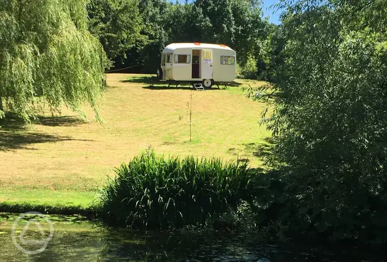 The site is found on the edge of a quiet village with thatched cottages and a welcoming village pub. It's a place to experience country life and a great location if you'd like to go off and explore. The pond is a focal point of the orchard with an abundance of wildlife, you might even have the chance to see kingfishers. Choose to pitch a tent or bring your caravan or motorhome on the spacious field. There are a number of excellent hardstanding and grass pitches, some with electric hook ups. Or, opt for 'Piglet', a cosy, fully furnished shepherd's hut built using a combination of modern and reclaimed materials. The interior features a double bed, a kitchenette, and an ensuite, along with quirky decor. A barn conversion and cottage are also available. Nestled into your relaxing spot, it's easy to forget that you're close to all major road routes, and just a mile and a half from junction 24 off the M1. East Midlands Airport is also just 3 miles away. While this is a tranquil space, there could occasionally be some distant sounds from these at peak times.