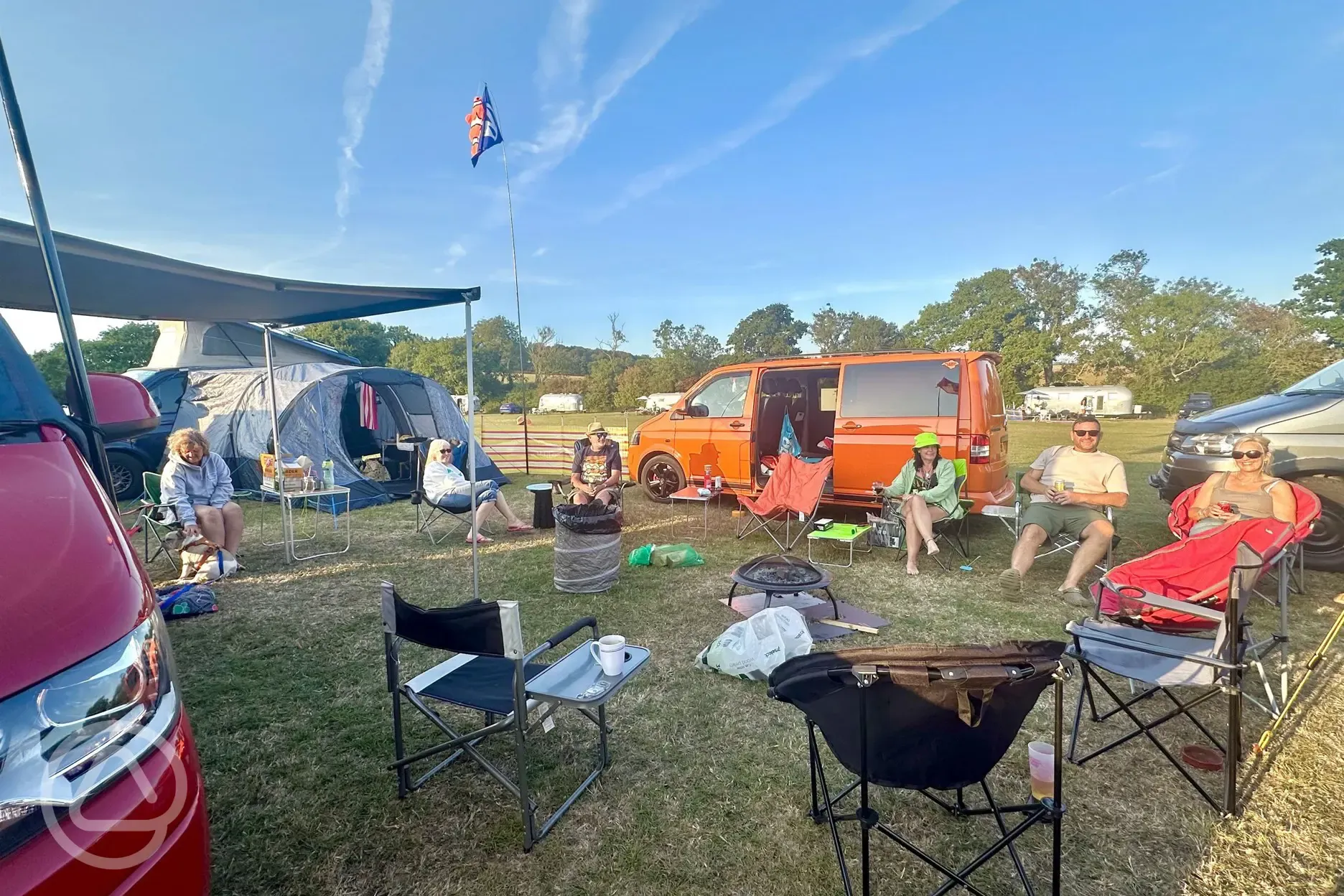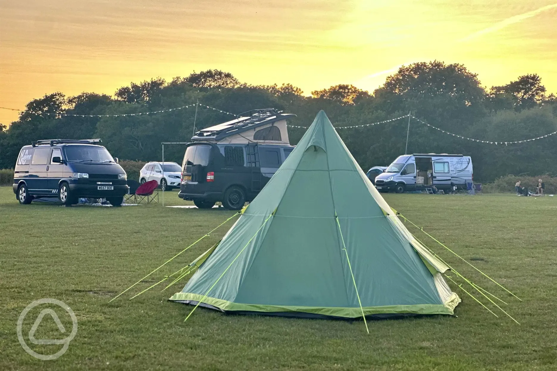 Unmarked grass pitches without electric. Suitable for tents, roof tents, trailer tents, caravans, campervans, motorhomes and RVs.