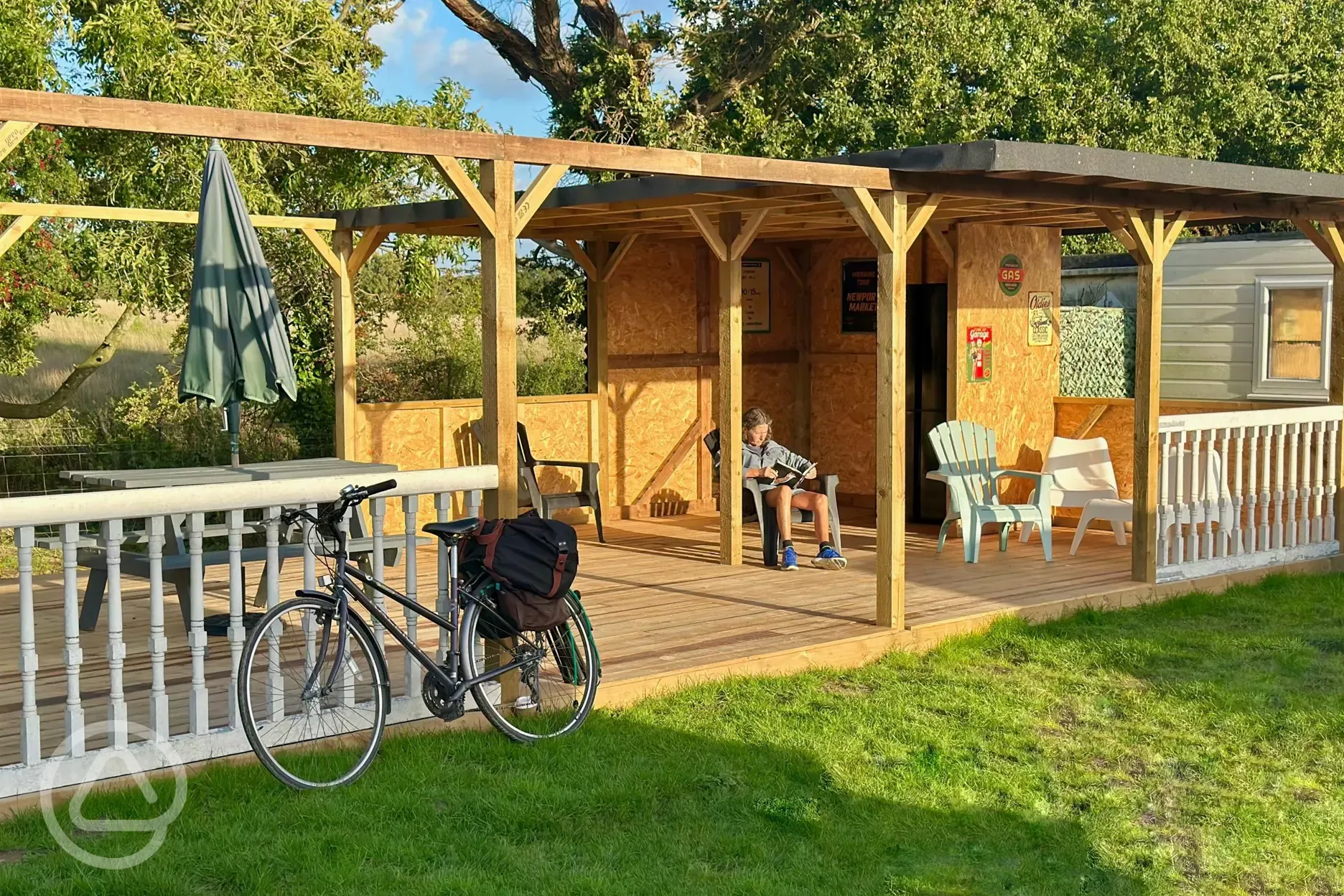 Equipped with a private double bedroom, a sofa bed, a kitchenette and shower facilities. Toilet facilities are nearby. Bedding is included. Outside a picnic bench, a parasol, a BBQ, and a fire pit.