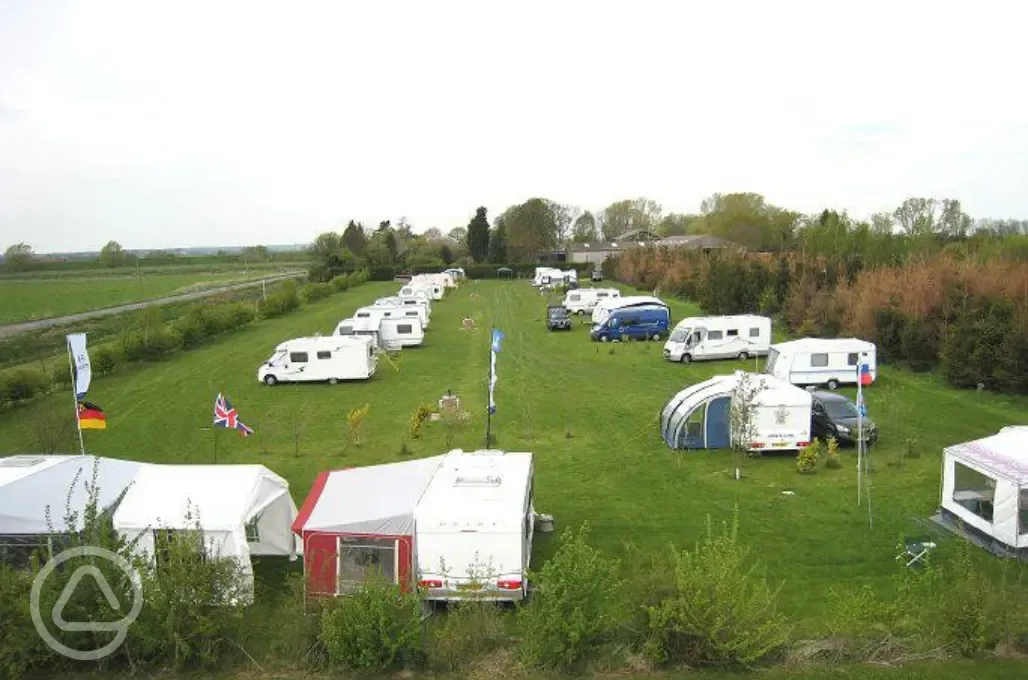 Grass pitches with an optional 15 amp electric hookup, suitable for tents, caravans, motorhomes, and small campervans only. Shared facilities are nearby.