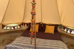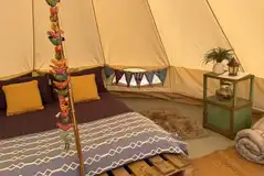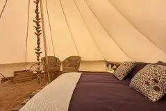 Luxury 5m bell tents furnished in a bohemian style with a double bed, bedding, side table, mirror, hanging rail, rugs, chairs and more. Also included is a fire pit with BBQ attachments. Two roll out beds can be provided to accommodate kids. Dogs welcome.