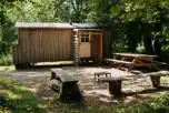 Furnished with a wood burner, double bed (with bedding) and two single futons (without bedding). There is also a kitchen with a two ring gas burner, sink, pots, pans and crockery. Outdoor picnic bench and fire pit, with access to shared facilities nearby.
