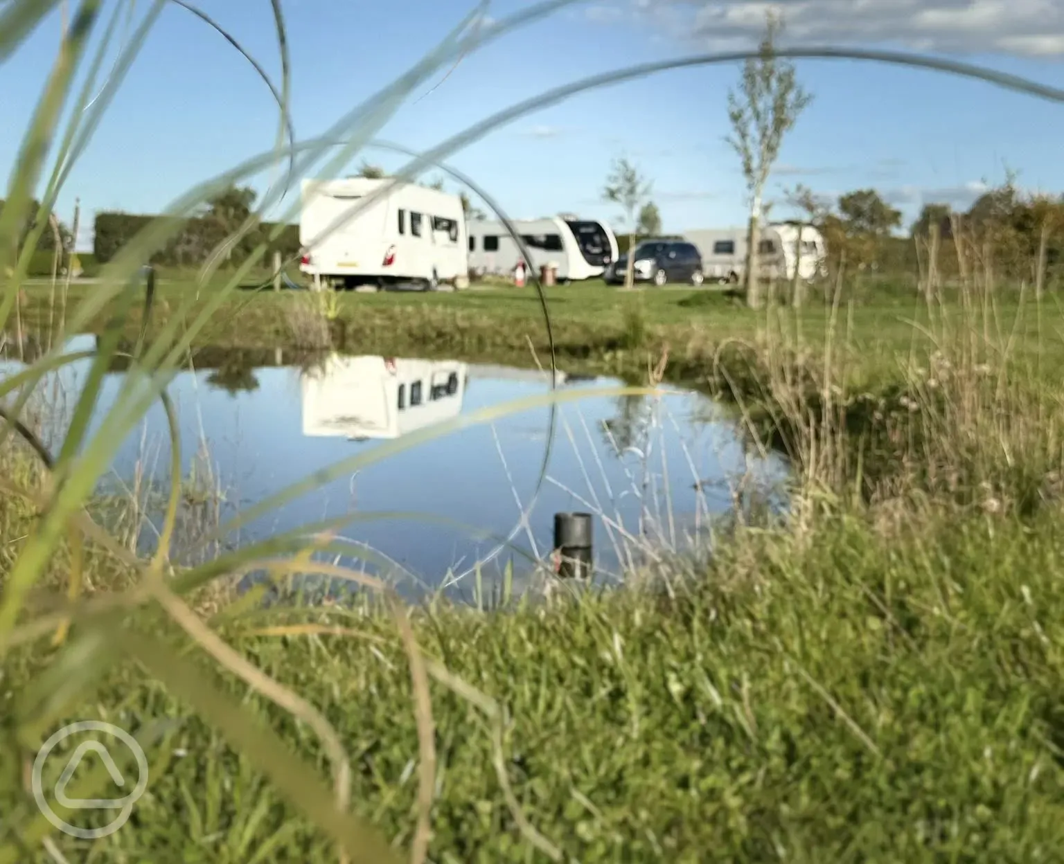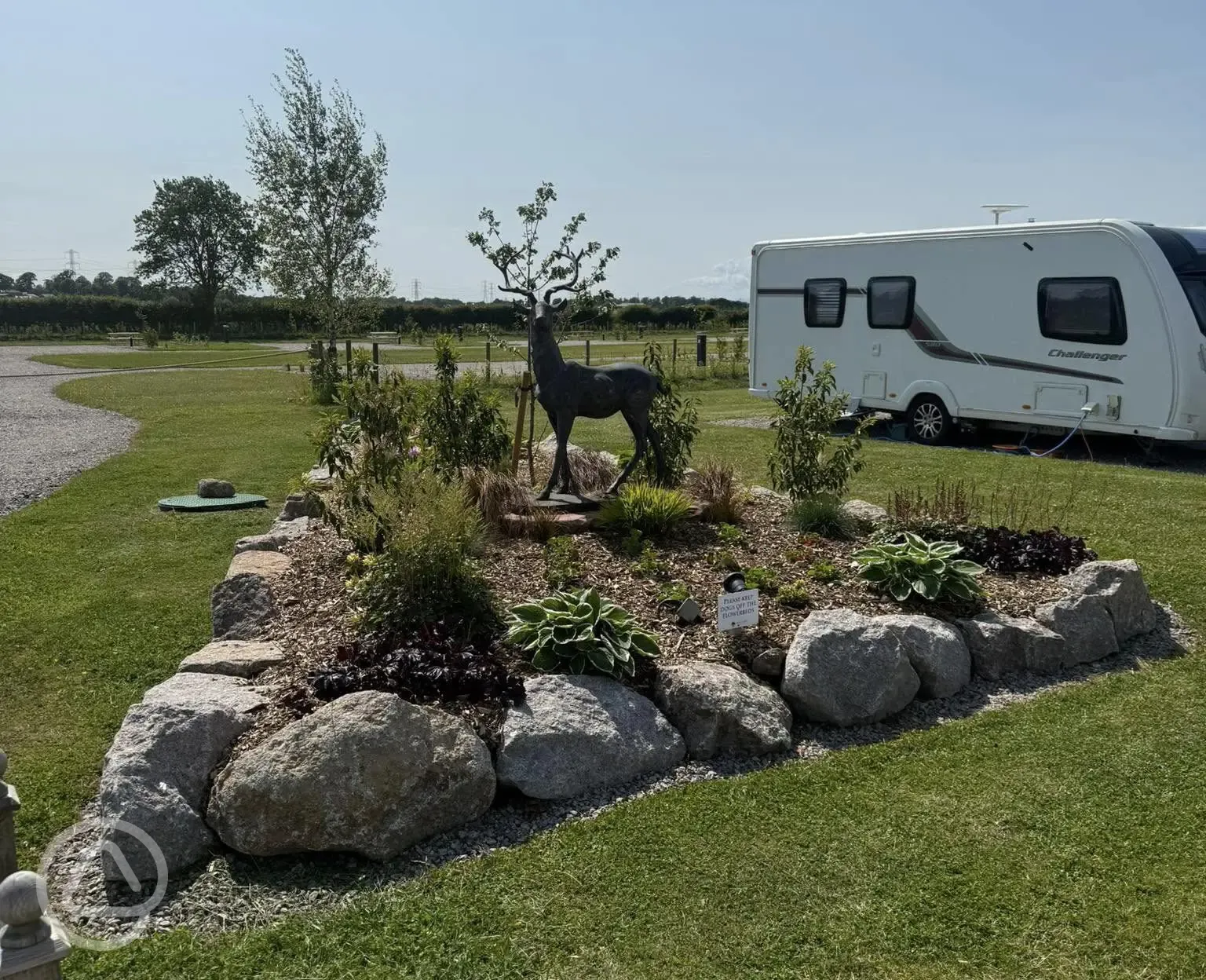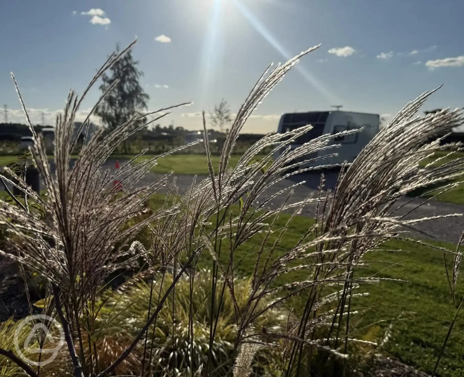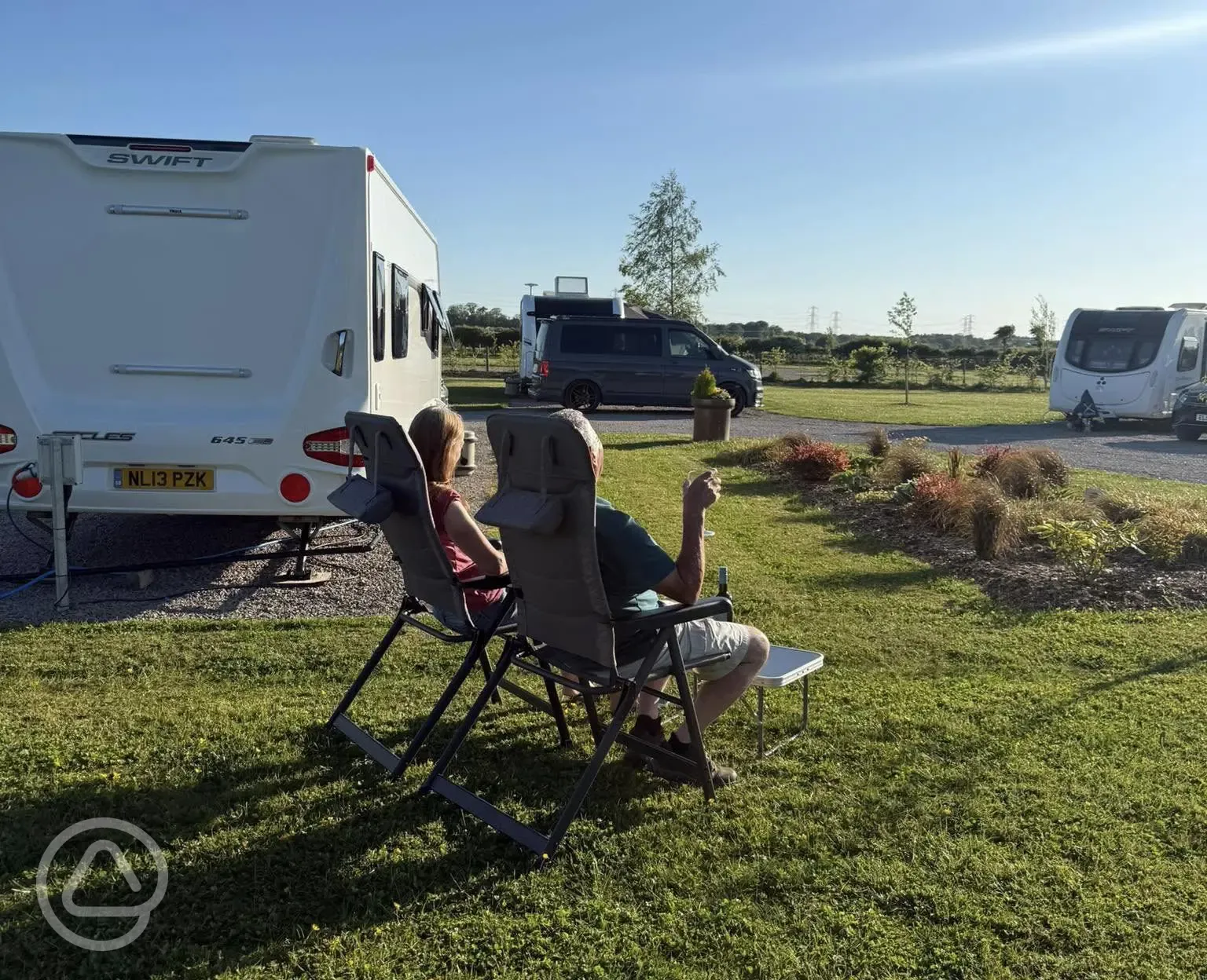 Hardstanding fully serviced pitch with 16 amp electric, grey water drain and drinking water tap. Hardstanding area for unit, awning and car. Grass area for sitting. Suitable for caravans, motorhomes and campervans up to 7.5m.