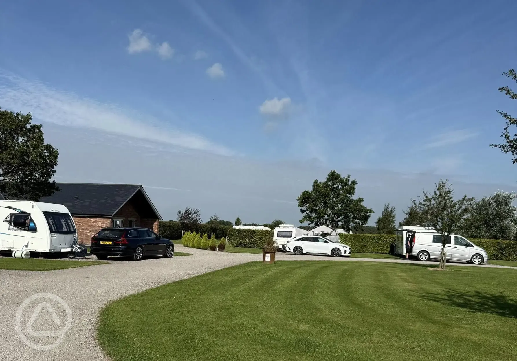 Hardstanding standard pitch with 10 amp electric, water and grey waste drain nearby. Hardstanding area for unit, awning and car. Grass area for sitting. Suitable for caravans, motorhomes and campervans up to 7.5m.