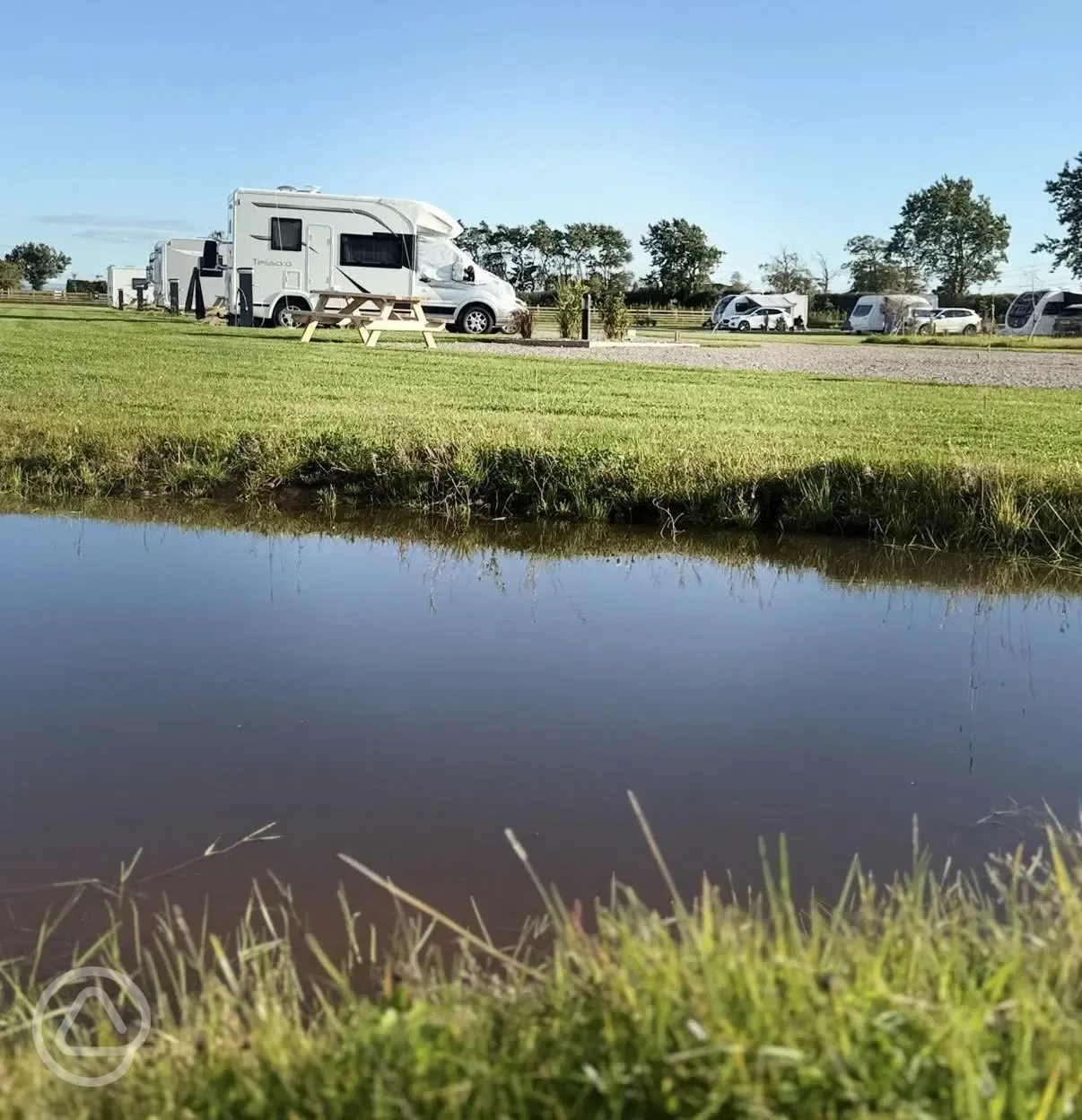 Hardstanding fully serviced pitches with 16 amp electric, grey water drain and drinking water tap. Hardstanding area for unit with grass area for sitting. Suitable for motorhomes and campervans.