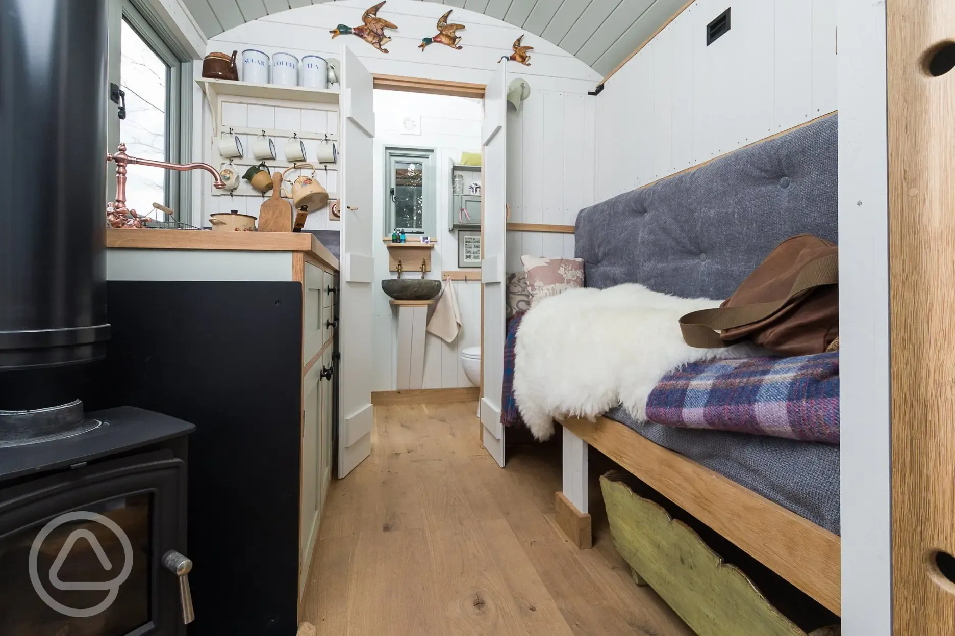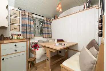 Beautifully finished shepherd's hut, designed to feel like a luxury hotel. The hut is 18 feet long and contains a double bed, seating, kitchen area and a bathroom with shower and flushing toilet.