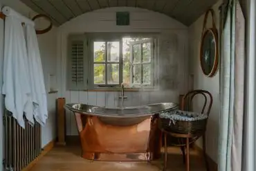 The peaceful Dimpsey Glamping Somerset is an adult only escape set in the Blackdown Hills National Landscape, on a small working farm with roaming animals. The three ensuite shepherd's huts are named after a West Country word for the dreamy half-light that comes at twilight or dusk. Relax in an equipped hut with a double bed, furnished interiors, a bath, plus a wood fired hot tub, an ideal romantic escape for two.
