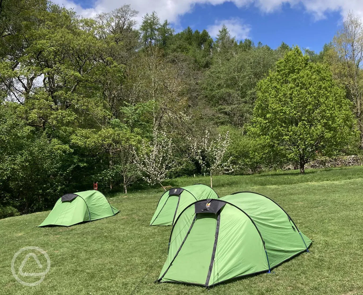 Grass pitches for small tents, with limited space for larger tents up to 5m in length also available. Pets welcome. Please reserve car parking.
