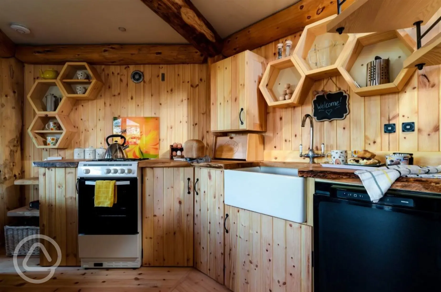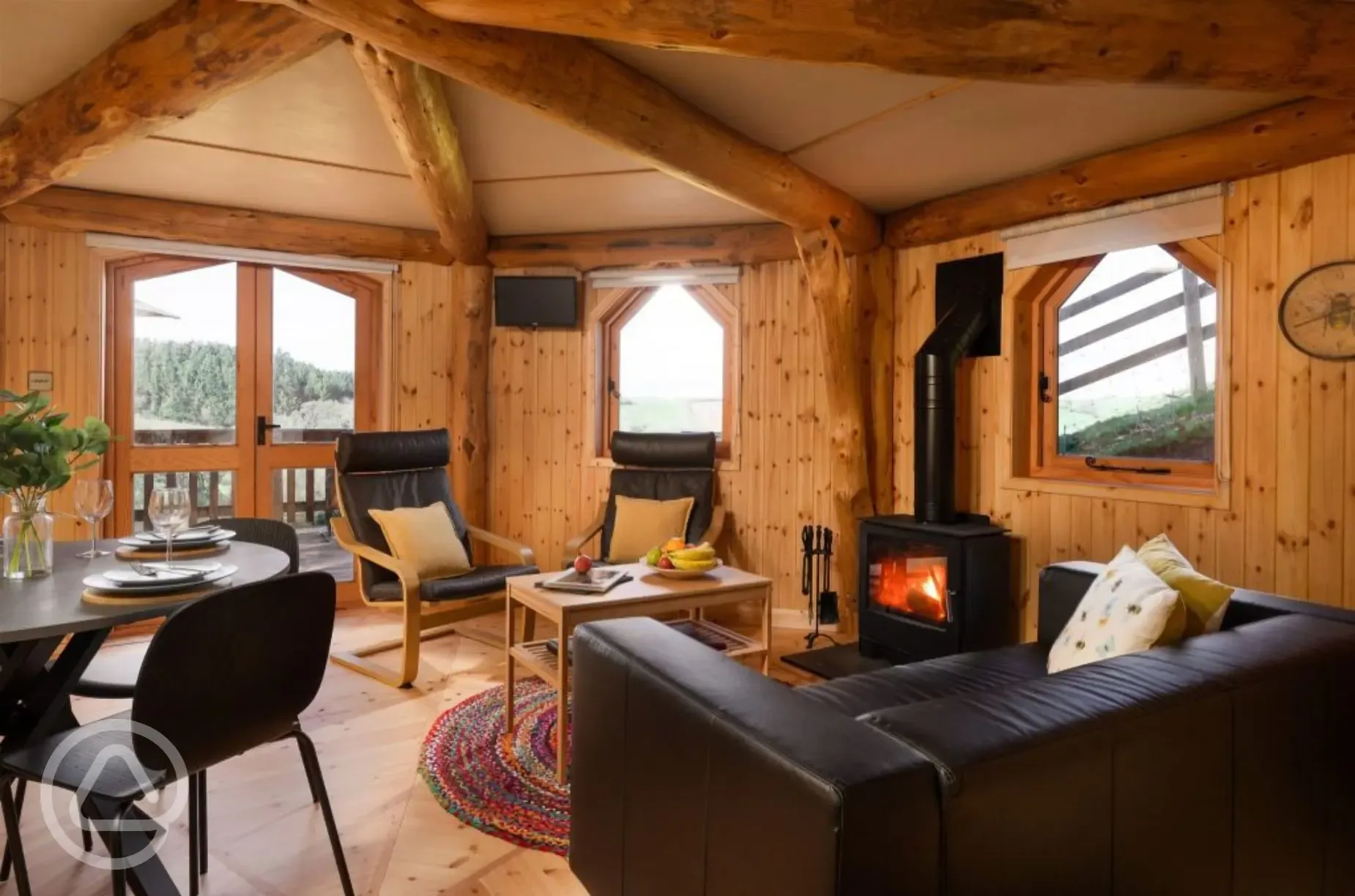 Stylish huts which each sleep two, each with a private kitchen, ensuite, wood burner, DVD player and USB charging points. Outside is a luxurious hot tub and fire pit.