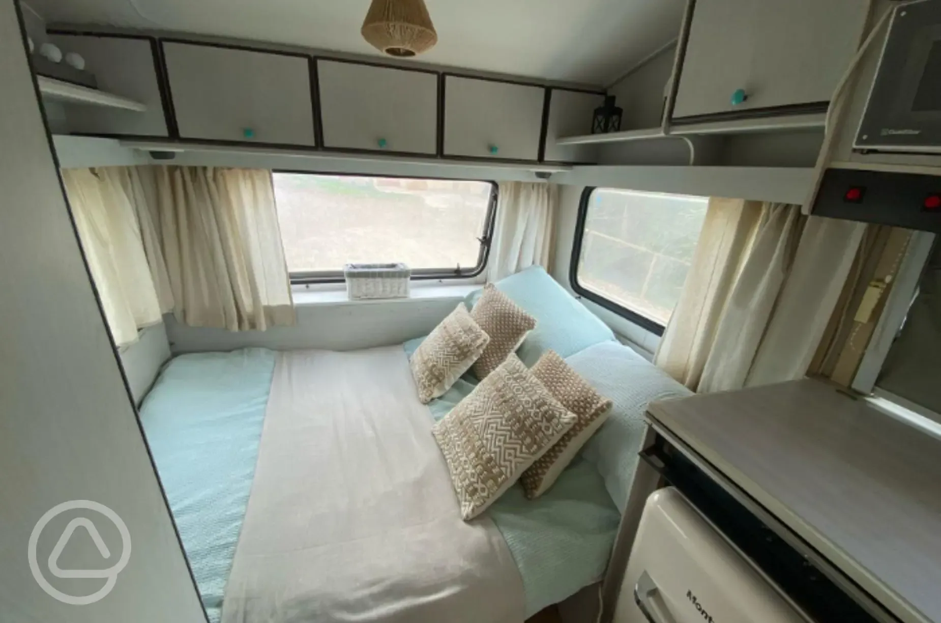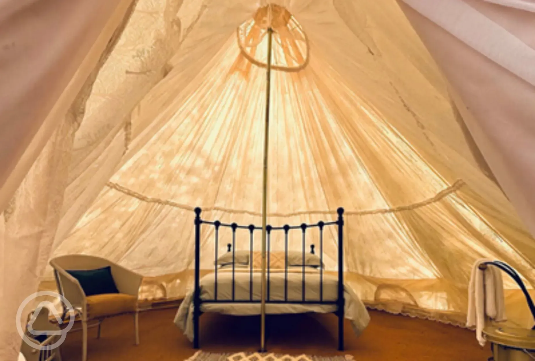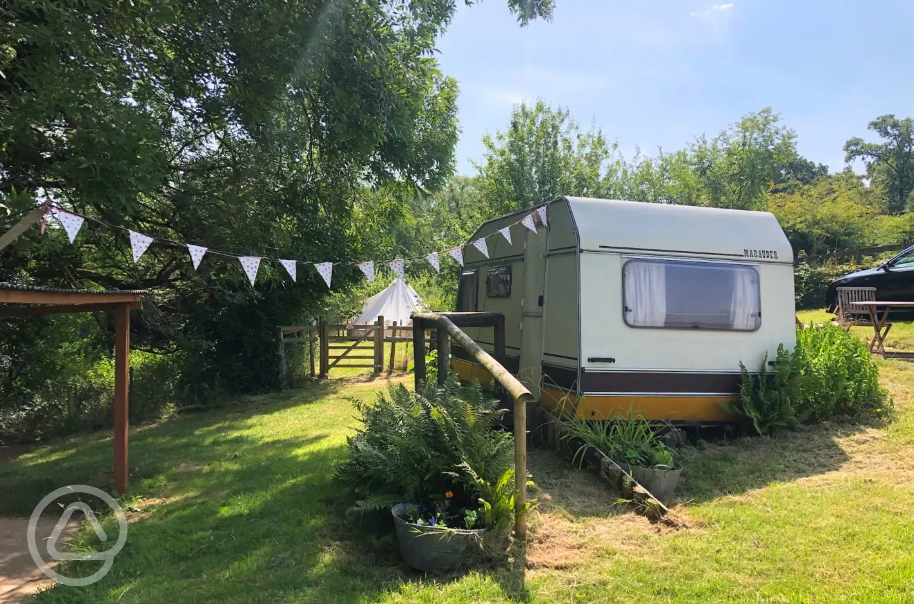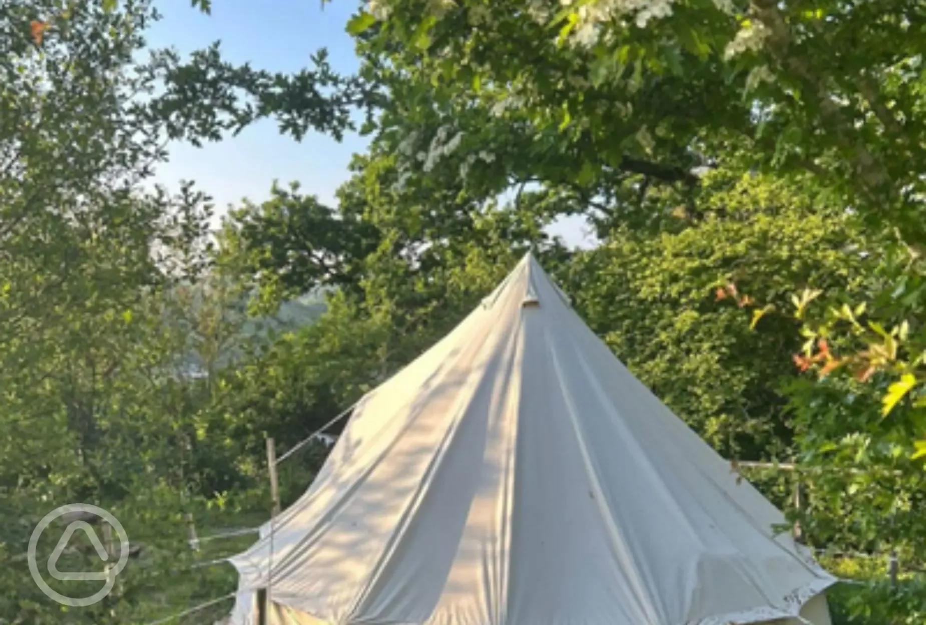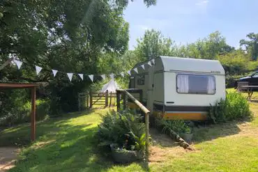 Boveys Down Farm welcomes all campers and caravanners. The farm is a quiet, rural located site off the beaten track and offers a peaceful and tranquil holiday for guests in the serenity of nature. There are pitches available with electric hookups for tent users and those in caravans and motorhomes. Dogs are welcome on site and in the touring and tent camping areas to holiday with you. For those who prefer to travel without a vehicle there's the option of renting the on site caravan which can be bolted on to group bookings or rented independently. It's a cosy, furnished space that can sleep up to 4 and provides an electricity supply. Inside you'll find a double bed, single bed and hammock along with an oven for cooking. Bell tents are also available for glampers containing a double bed and two fold out beds in comfortable luxury.