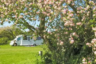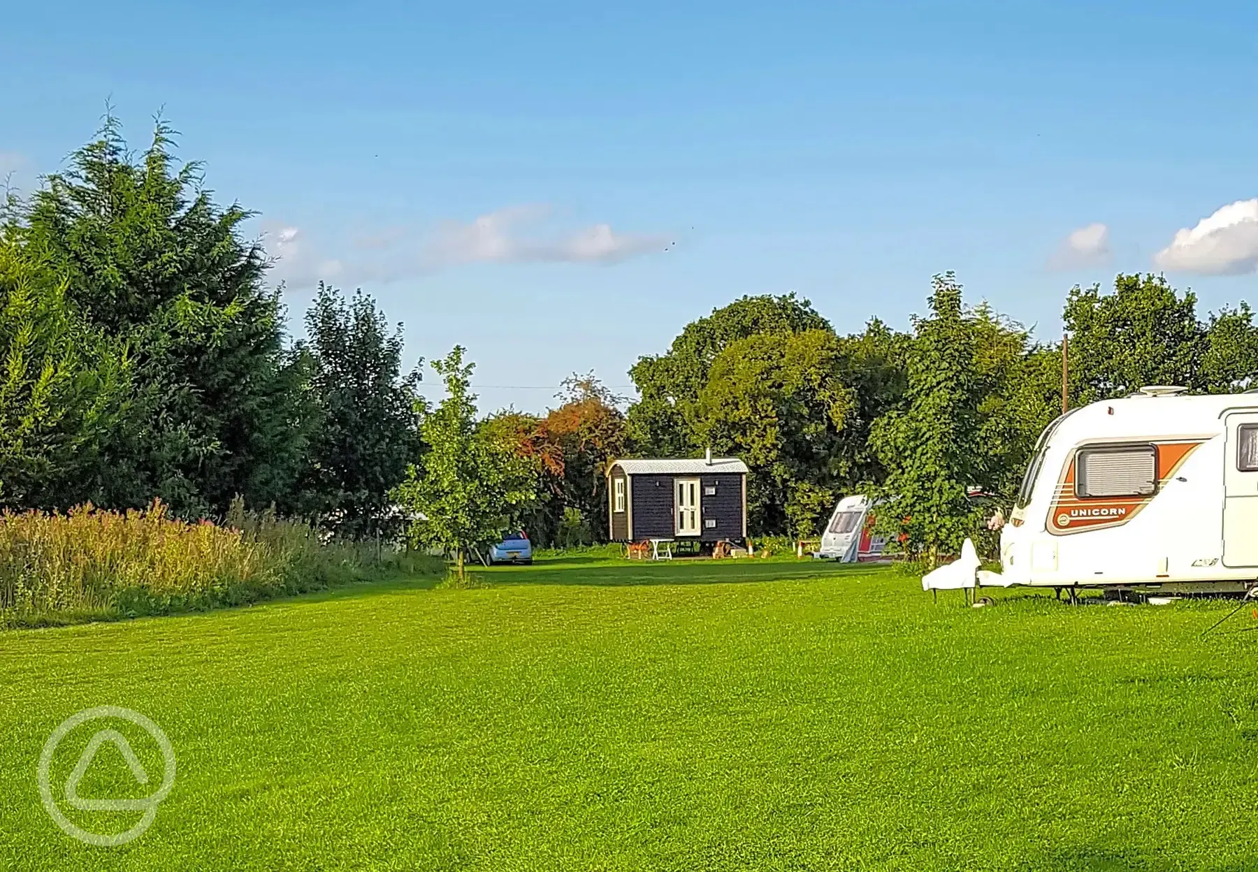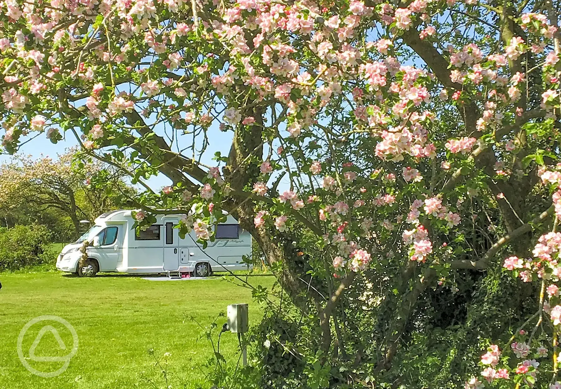 Grass pitches for tents, caravans and motorhomes with EHUs.