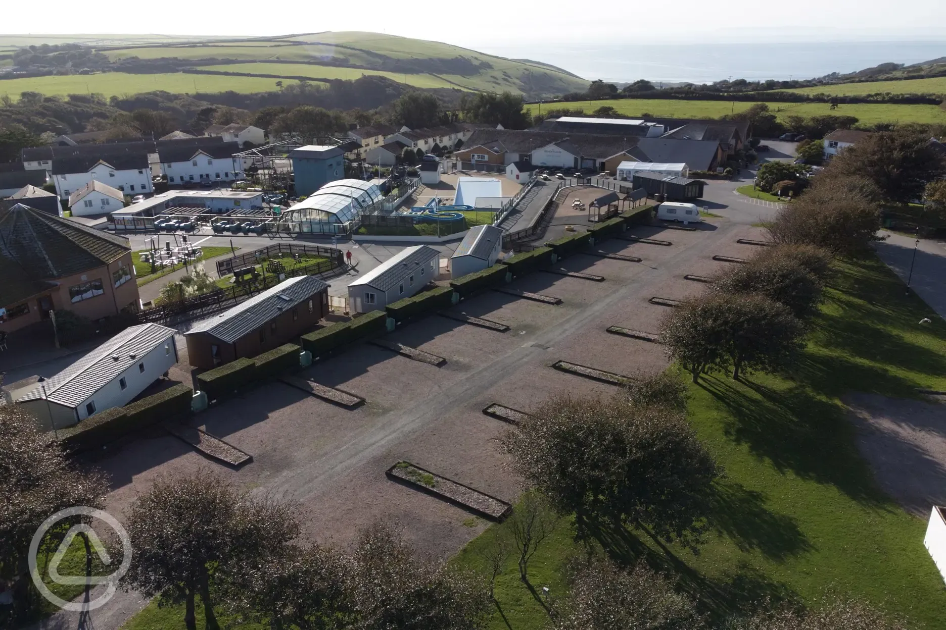 Gravel hardstanding pea shingle base averaging, 10m x 10m, with 16-Amp electric, a TV aerial point, drinking water and waste disposal. These offer a night light and on pitch parking.