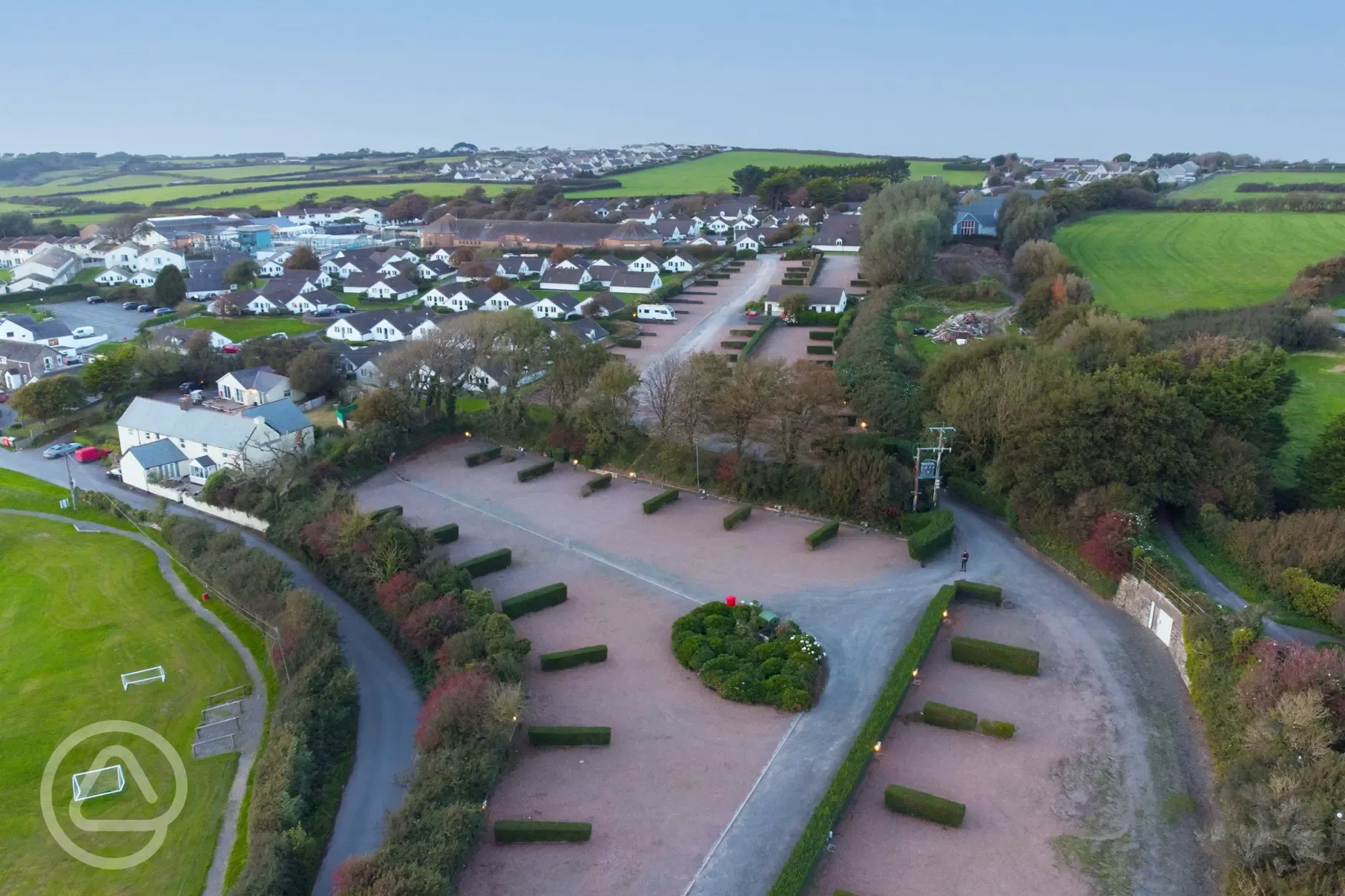 Gravel hardstanding pea shingle base averaging 10x10 metres, for tourers with awning space and 16-Amp electric.
