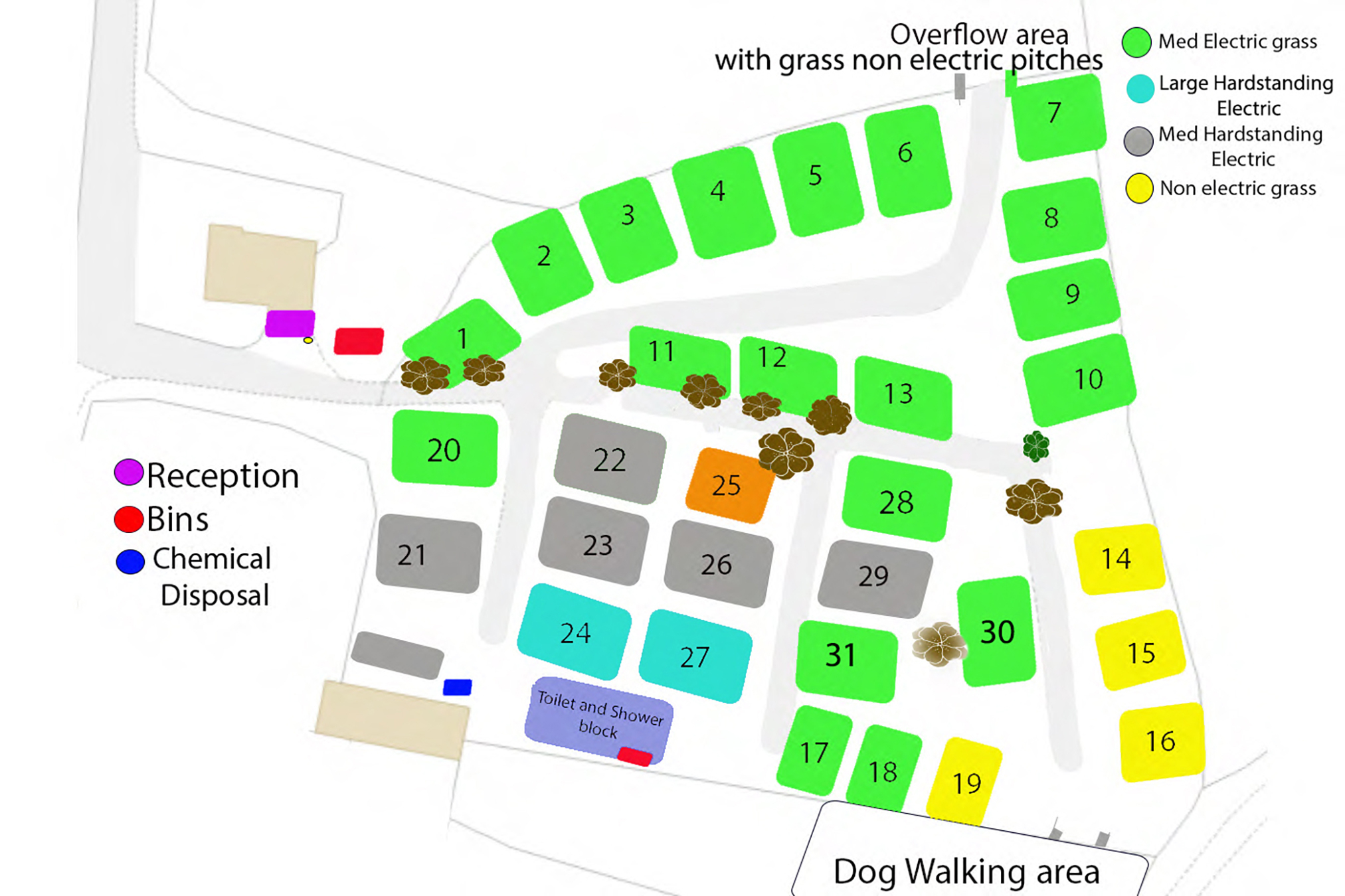 Large half grass, half hardstanding pitches offering 16 amp electric hook up, suitable for tents, roof tents, trailer tents, campervans, caravans, motorhomes and RVs. Measuring approximately 15m x 17m.