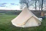 Bell tent with a king size bed, twin beds and space to bring an extra bed. Includes chairs, rugs, lighting and bunting. Outdoor picnic table and cooking hut with a gas hob, cool box and fire pit. Optional bedding hire. Parking 5m away. Dog friendly.