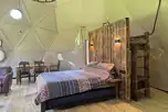 Dome: double bed, bunk beds and truckle bed, log burner, sofas, dining area. Separate private bathroom. Equipped kitchen with a fridge, induction hob, microwave, toaster, kettle, electric. Picnic table and fire pit. Bedding included, please bring towels.