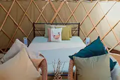 Yurt interior with a double bed and seating area