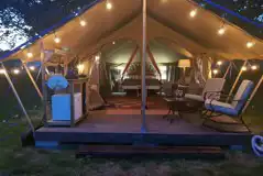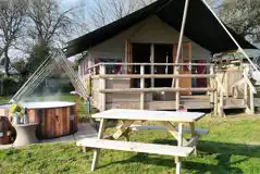 Spacious safari tents sleeping up to five across two bedrooms and an inside bathroom. There's a well equipped kitchen with a fridge, log-fired stove, and all the necessary utensils. Outside you'll find a decking area with seating and a private hot tub.