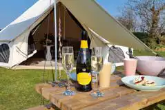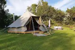 Spacious, well equipped bell tent with a double bed and two single beds. Indoor and outdoor seating area, power, kitchenette, cooler box are also provided. Shared facilities nearby. Please note bedding is not provided.