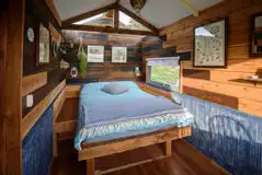 A glamping hut with panoramic views and a private garden. Inside a double bed and rustic furnishings are provided, perfect for two. A skylight is provided for romantic stargazing. Access to shared WC/shower facilities nearby.