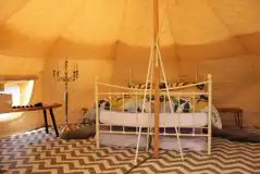 Fully furnished bell tent for two adults and two children. Complete with an outdoor camp kitchen, double bed and camping beds. Bring your own sleeping bags for the children or one can be supplied. Bring towels. Shared facilities nearby. Sorry, no dogs.