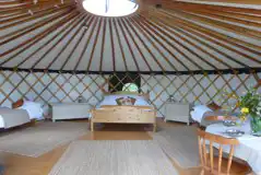 Sleeping up to six, these spacious handmade 22ft yurts each include a double bed and four single beds with a private bathroom and field kitchen.