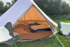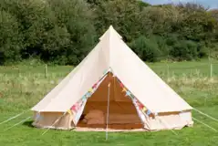 Bell tents measuring 5m x 5m are equipped with mattresses, mattress toppers, sheets, linen, and pillows. Tents are located near the shared toilet and shower facilities. Dogs are also allowed!
