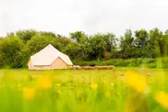 The group bell tent setup includes four 5m tents and one 6m tent arranged around eight hay bales. They include mattresses, bedding, decor, and a private toilet and shower.