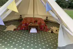 Furnished bell tents where you can set up wherever you choose. Equipped with a double bed, rugs and side tables.
