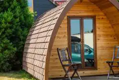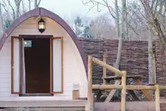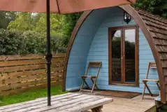 2.5m x 3.5 m camping pod suitable for five adults. The pods are heated and include electricity, and guests will find a decking area and a picnic table outside. Bedding or mattresses are not provided.