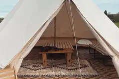 Partly furnished 5m bell tents with lighting, electricity, indoor matting, coffee table and a rug.