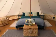 This furnished bell tent is ideal ofr two, including a furnished kitchenette, double bed, storage for clothes and bedside tables. Electricity access is included, and an outdoor 'glawning' area is also provided, so you can stargaze no matter the weather.