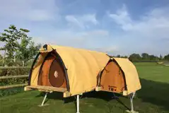 These value pods sleep 2 in either a double bed or two singles that can be slotted together. Dogs can join guests in a kennel pod next door. Both have either an EHU or solar power with USB ports and insulation for comfort.
