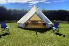 Cosy 5m bell tent equipped with camp beds (please bring your own bedding). Shared facilities nearby. Pet free.