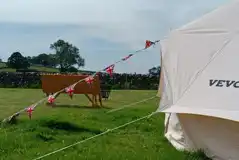 Bell tent sleeping up to four with optional airbed hire, please bring all you would for camping. Outside is bunting, a fire pit and picnic bench. Shared facilities nearby. Dogs welcome.