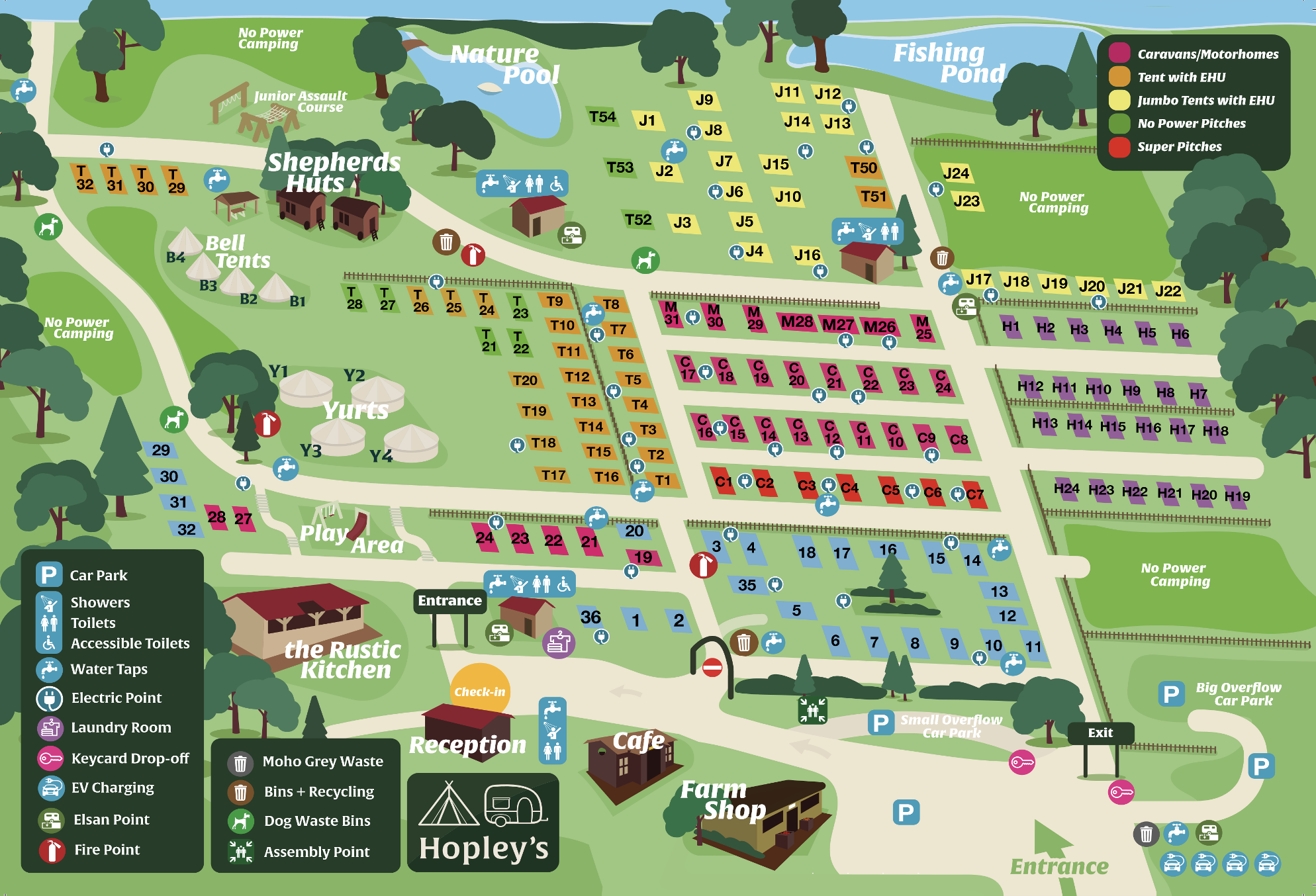 Hopley's Farm Shop is open daily from 8am until 6pm, selling local produce, dog ice creams, trinkets, and other supplies. The Reception and Camping Shop (open daily) is filled with essentials, treats, and toys, along with offering gas exchange.