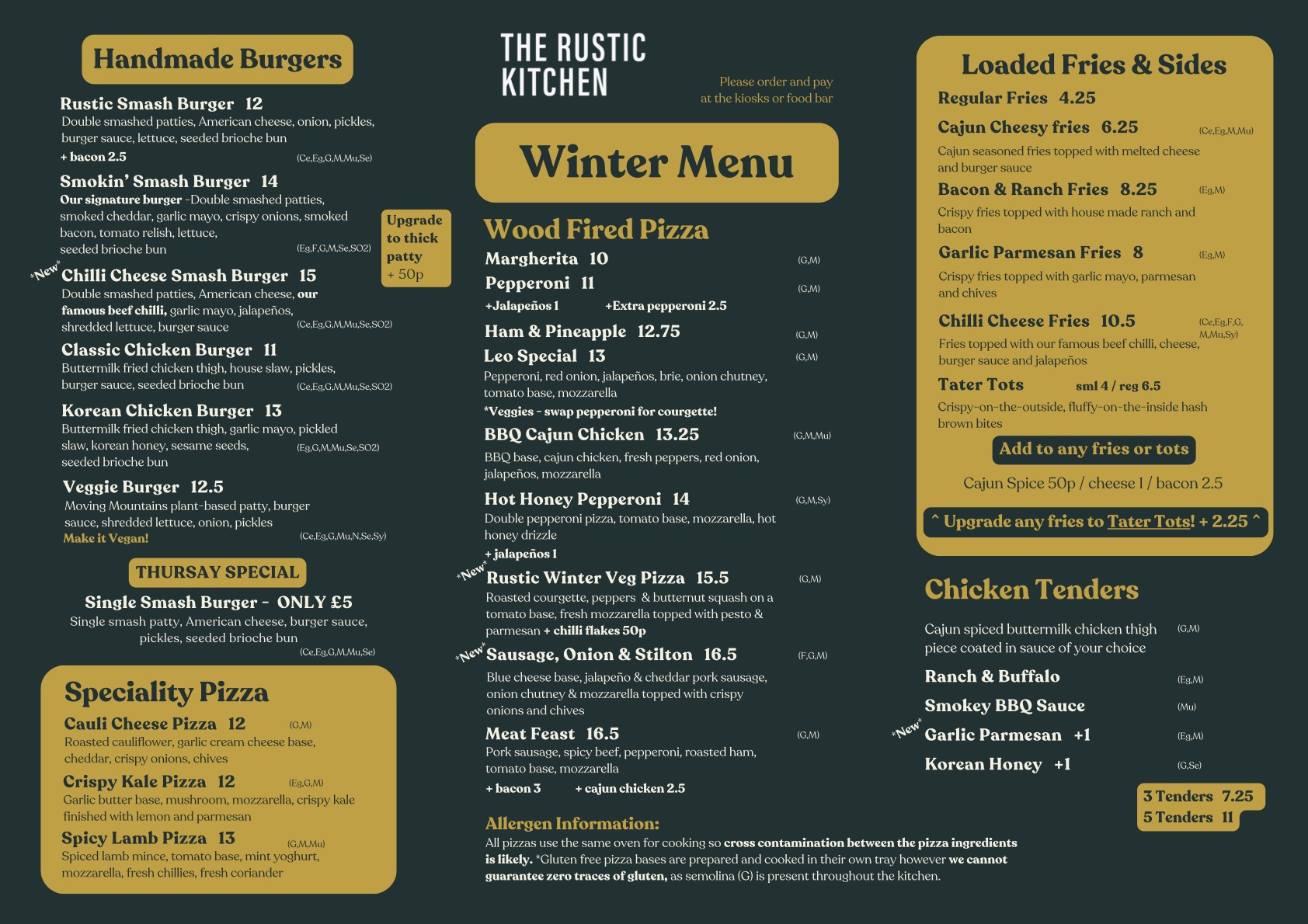 The Rustic Kitchen (open Easter to September) serves fresh stone-baked pizzas, homemade burgers, and seasonal favourites for dining in or takeaway. It is open Wednesday to Saturday from 4pm to 10pm. The site's cafe is open daily from 8am until 2pm, offering hot and soft drinks, as well as breakfast and lunch options.