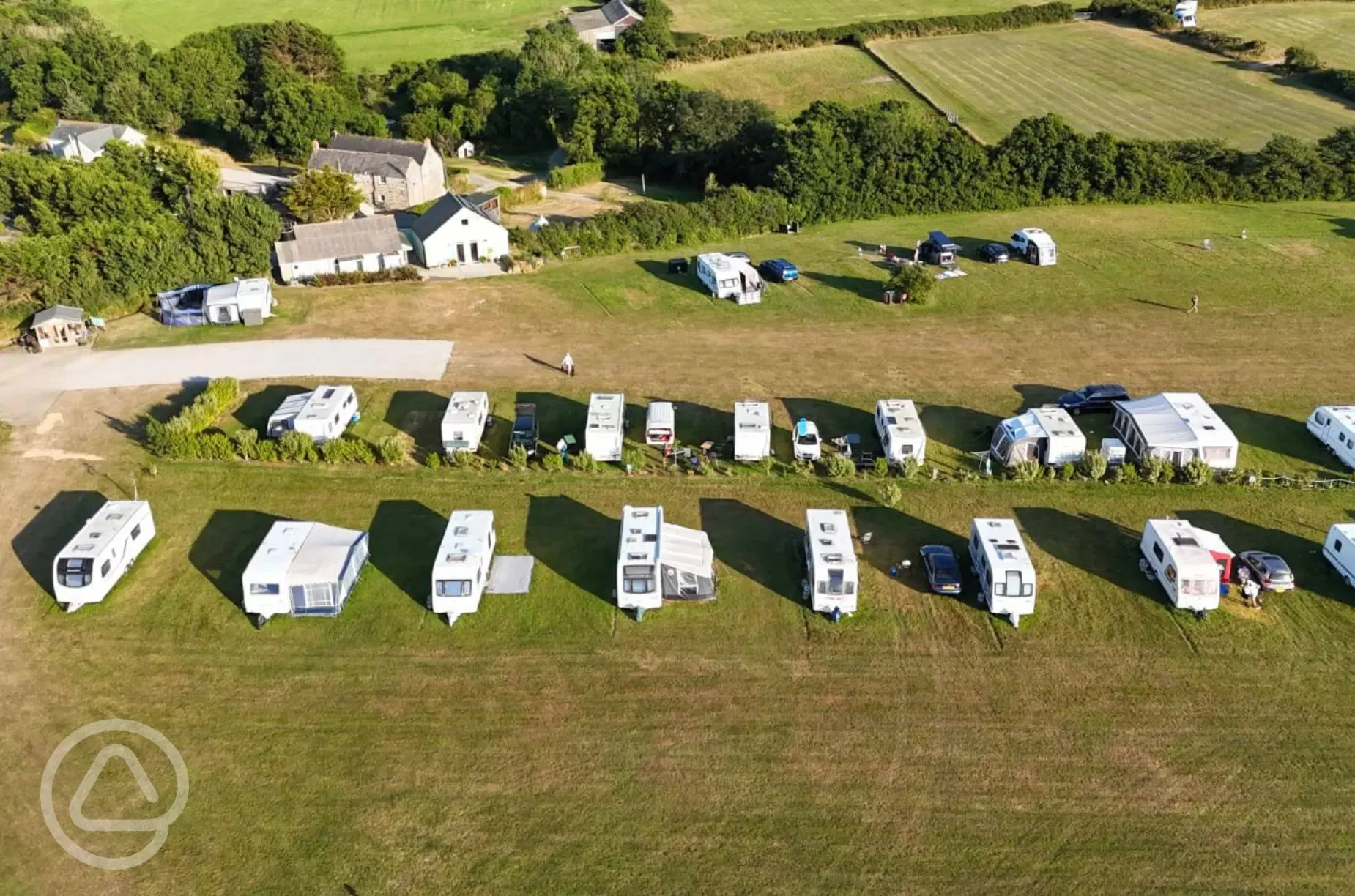 Spacious grass pitches for tents and caravans. Optional electric. Sized at 11m x 11m. Free showers & toilet blocks are located close by.
