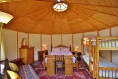 Large 5m wooden octayurt with a king size bed, two bunks and a double sofa bed. Cosy furnishings include a dresser, desk, side tables and rugs.
