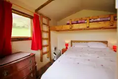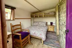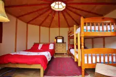 Standard 4.2m wooden octayurt furnished with a small double bed and two bunks.