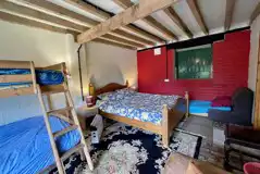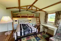 A cosy cabin located at the end of the stable cottage, complete with a double bed and overhead single bunk. Cosy interior with a side table, chairs and dresser.