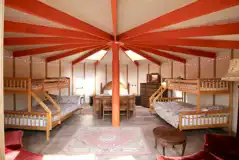 Large 5m wooden octayurt with a king-size bed and two triple bunks (each single over double). There is also a desk and two sofa.