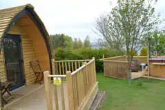 A rustic pod with its own unique view. This pod comes with a private hot tub, microwave and TV/DVD.