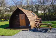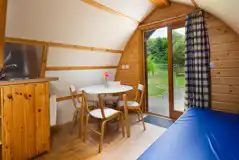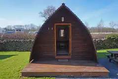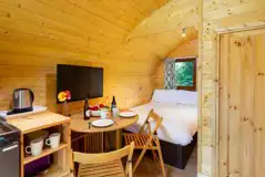 This pod sleeps two adults and up to two children with a double bed, plus a double sofa bed, both with mattresses. There is an ensuite shower room with a toilet and separate wash basin, a small kitchenette, chairs and a dining table. Sorry, no dogs.