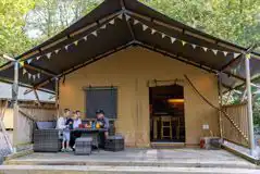 Fully equipped safari tents sleeping up to six guests. Each includes a double bedroom, one twin room, and a secret double bed hidden in a cabin in the wall. They also have modern bathrooms, log burning stoves, and Chesterfield suites.